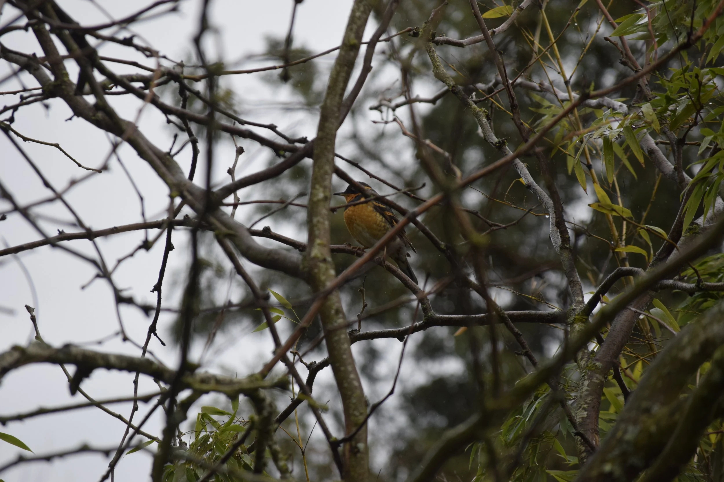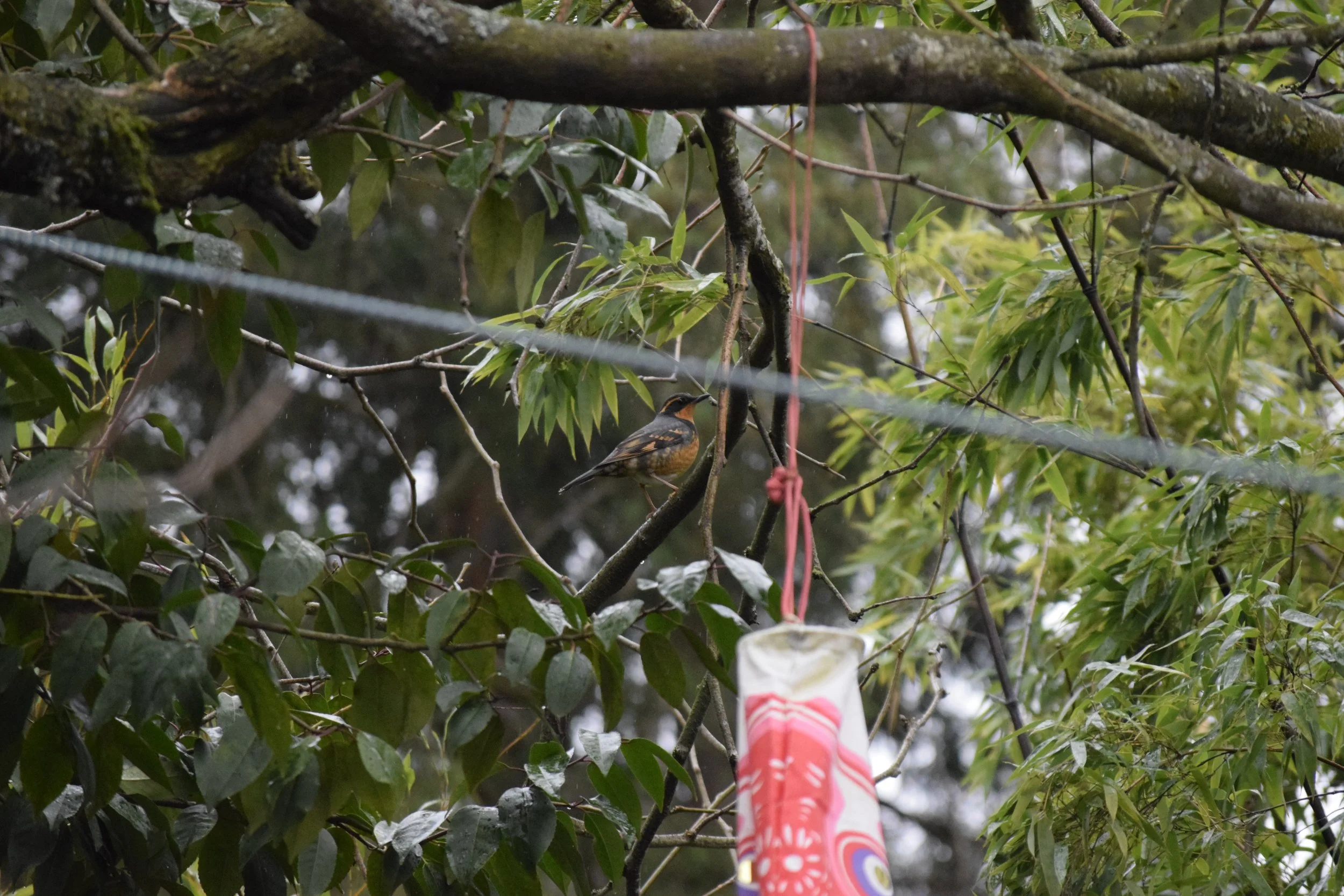 Varied thrush in the tree, gotta wonder what it thinks of the giant fish?