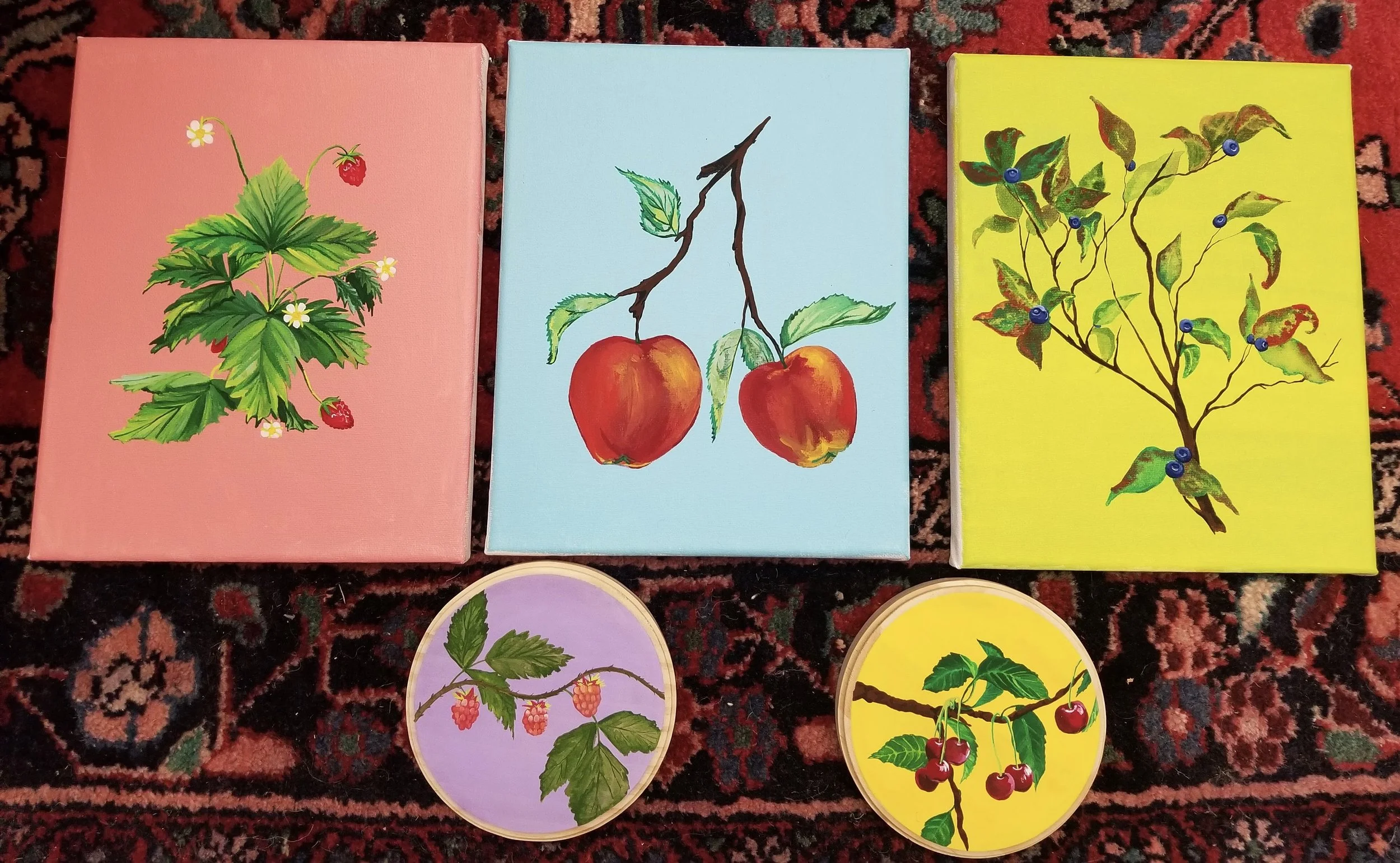 Sometime after moving into her new house my sister requested some fruit paintings for her dining room, I have finally obliged. She had sent me examples of different styles that all had lots of color and were somewhat leaning toward pop art. She said she knew she wanted apples and strawberries, but the rest was up to me. I kinda walked the line between realism and pop art. The background colors were inspired by her house, and I can’t wait to see them there.