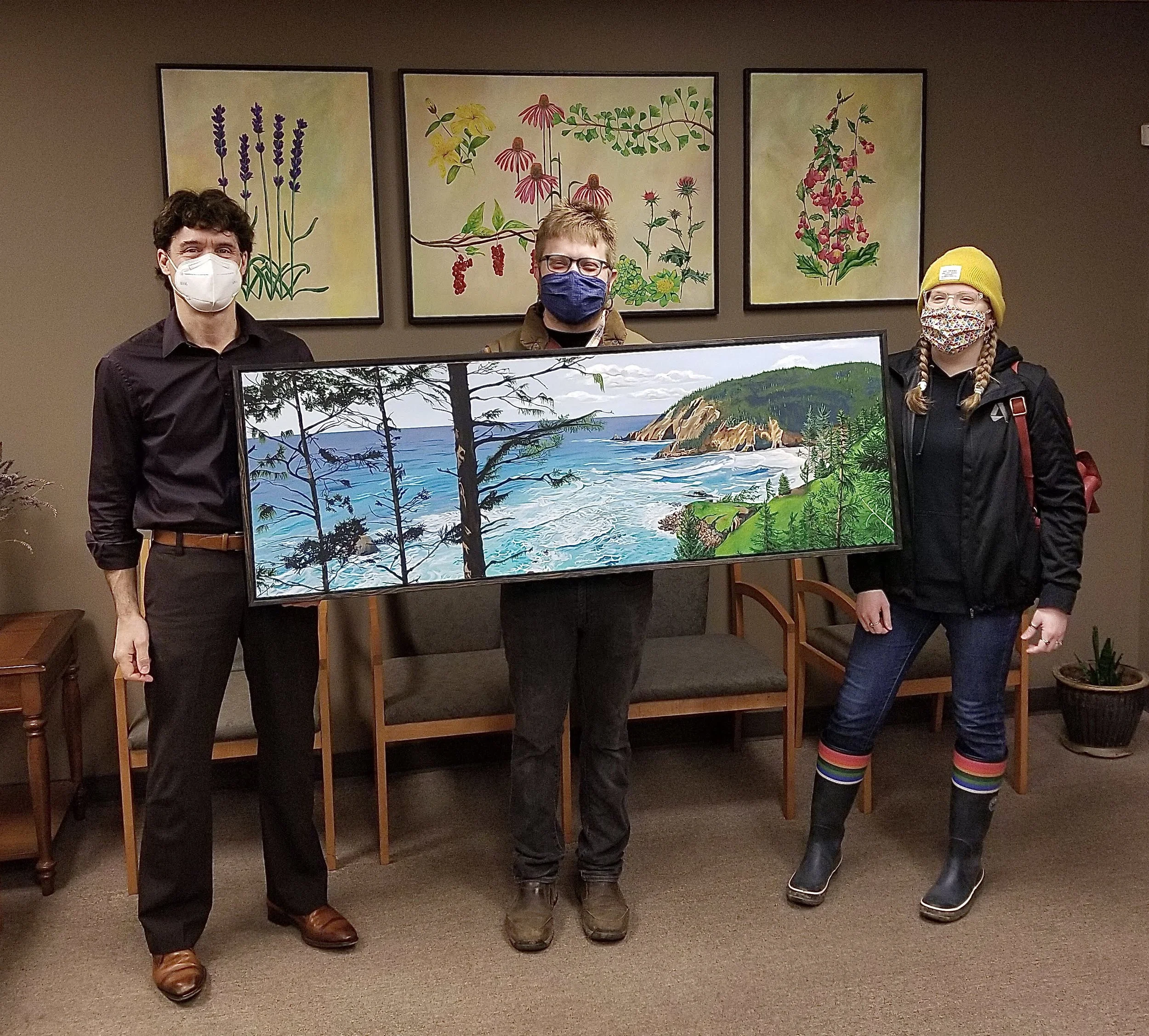 Indian Beach From Ecola, with Dr Agger, Cory and myself holding it up. Behind us are florals they commissioned of herbs used in their practice.