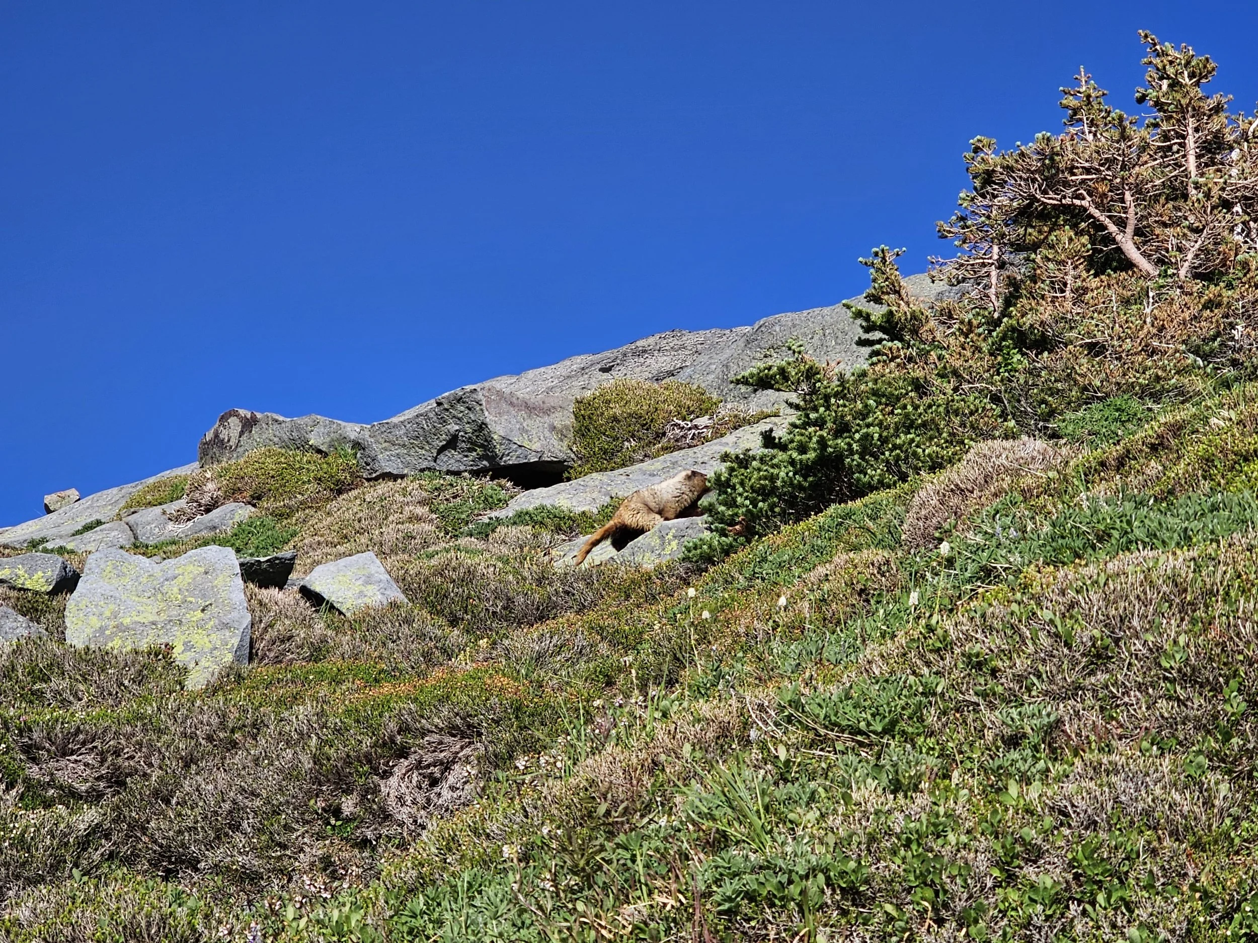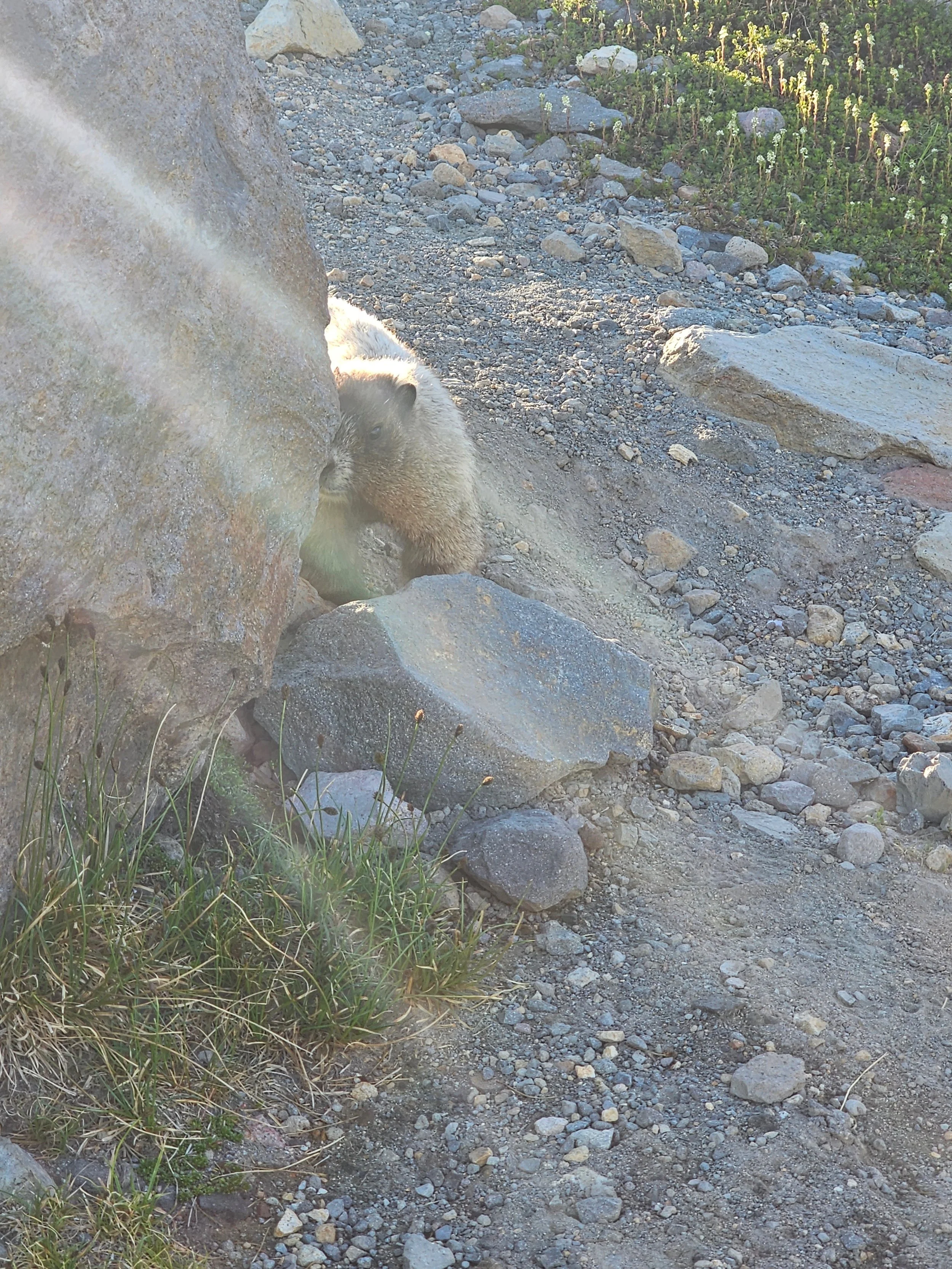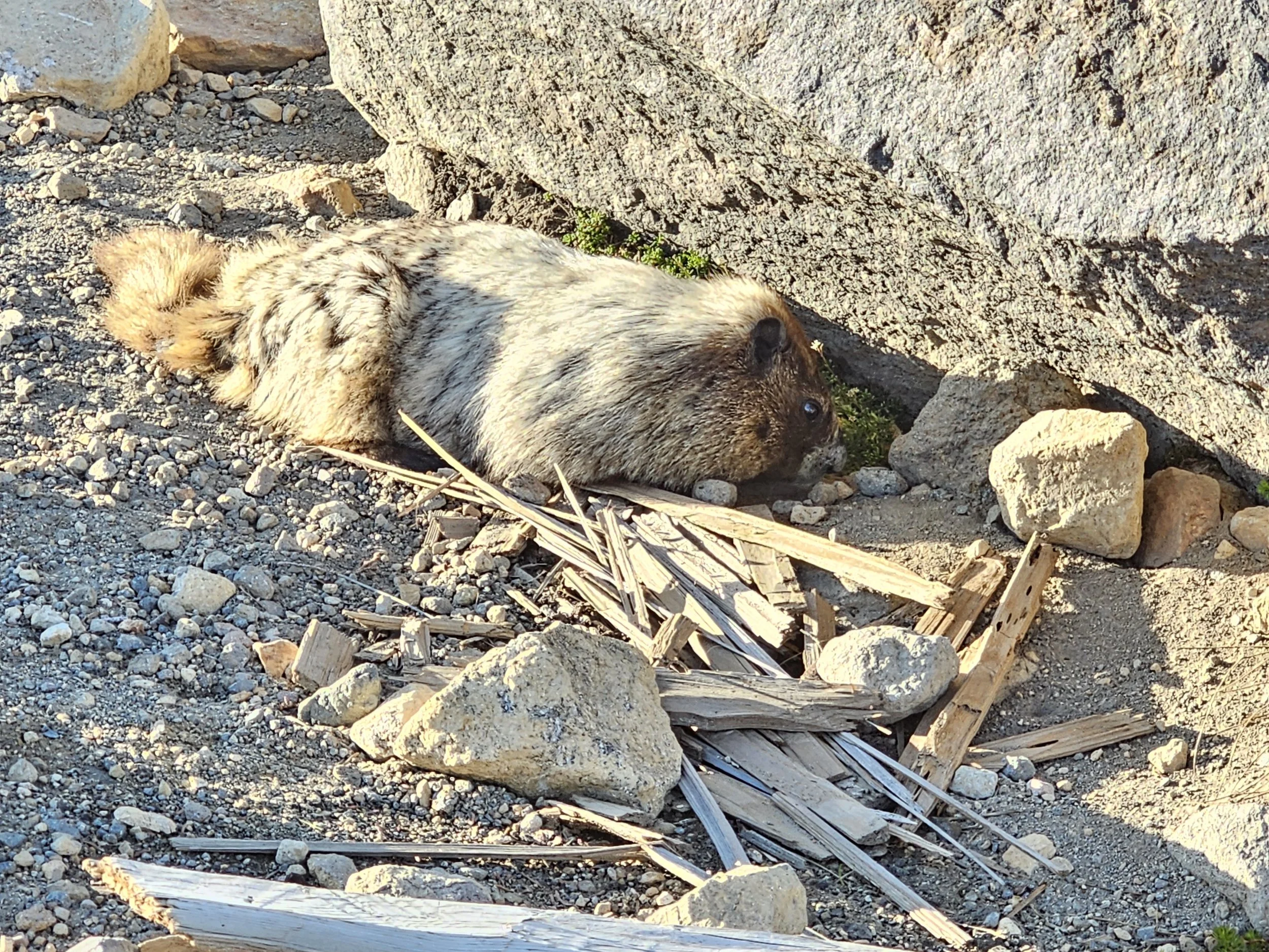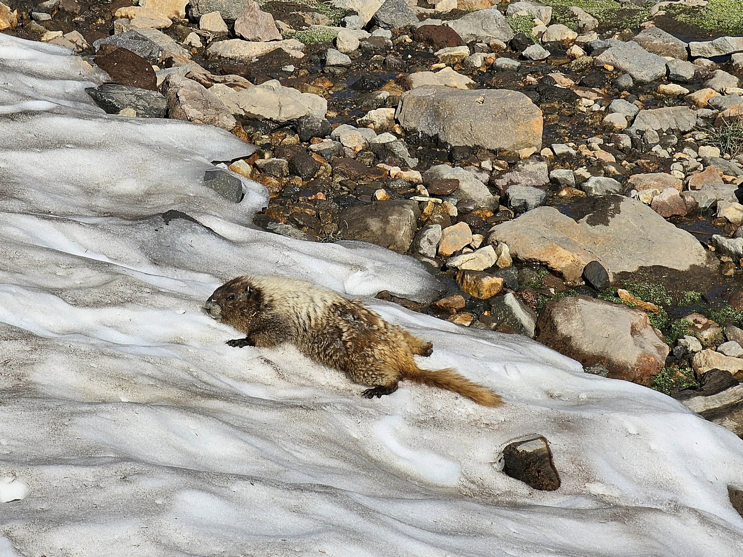 We watched this marmot for a while as he walked around, then went sploot! Down on the snow to cool off. So relatable haha!