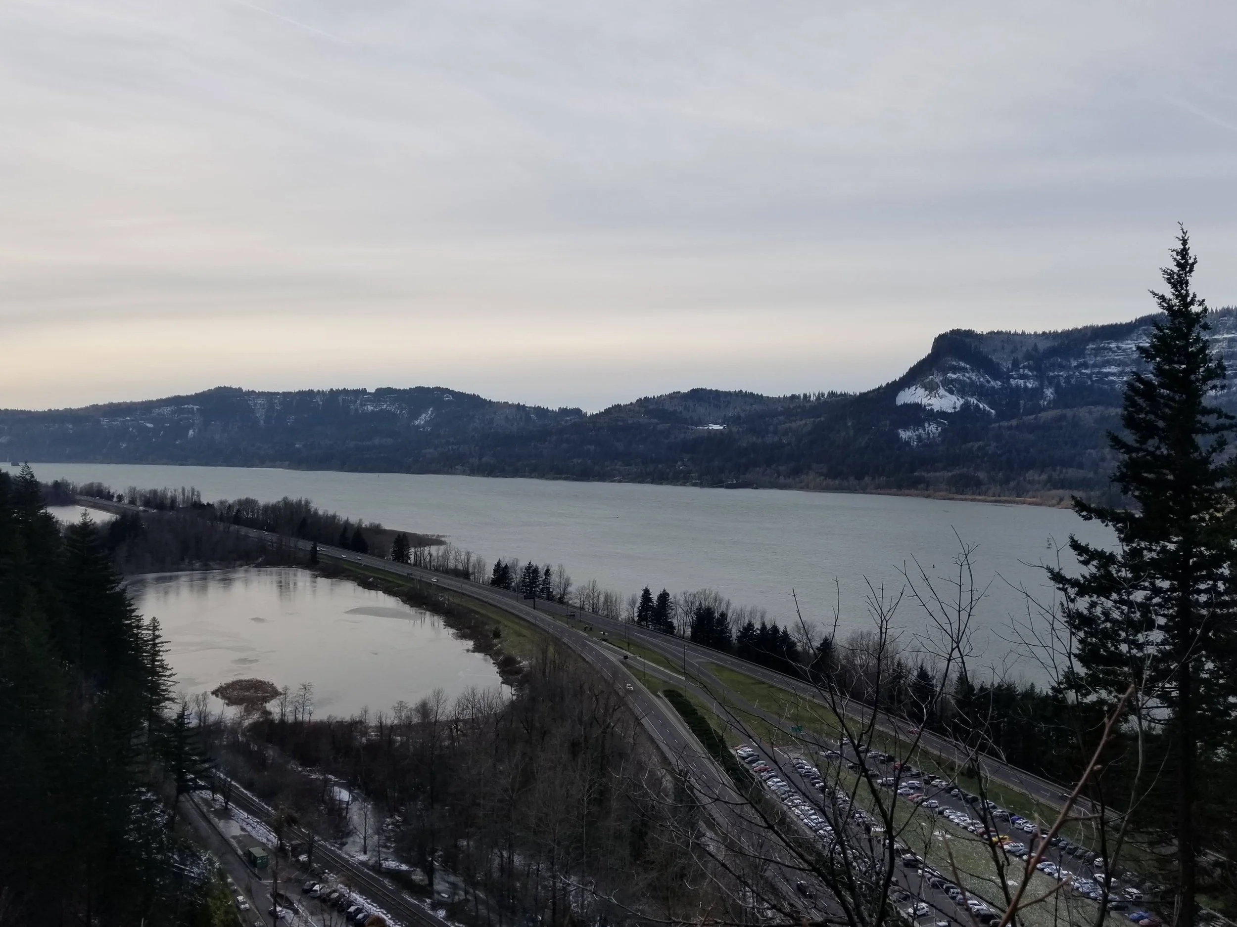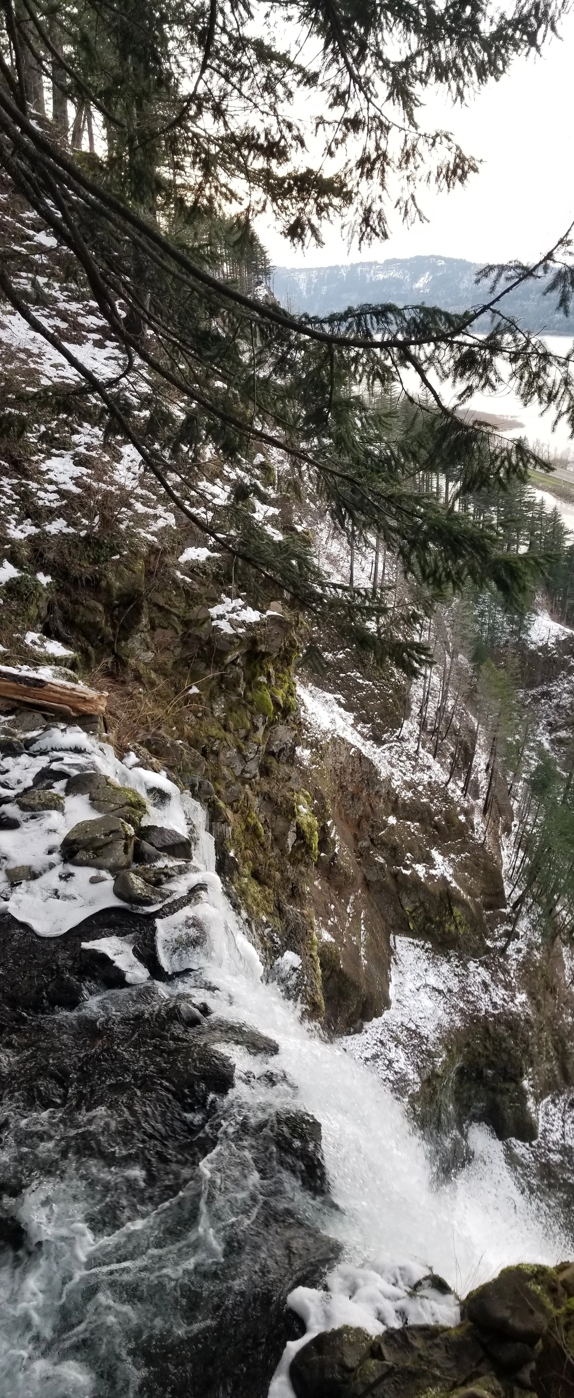 The hike is 2.4 miles round-trip to the top and back. That’s 1.2 miles up on 11 switchbacks going up the side of a cliff with the highway and Columbia River below. The trail is in pretty good condition- but it has jagged edges, no railing (for the most part), and suffered a fire recently so erosion is a MAJOR concern so trail-cutting is a big no-no (which we saw going on and called out.. it causes more erosion which =landslides &trail closures). You gain 870 feet in elevation on this hike so it’s a workout and the trail is all at an incline. All of this with exception of some rather small patches was covered in ice and was a news story a few days before where a lady slipped off a trail and slid 30 feet to where she was holding on to a tree root from a 300 ft cliff.. Scary. It doesn’t have to be though. Cory and I use spikes when we hike in ice and we even jog in them along the icy trails. We bought ours a few years ago for $25 on Amazon and they are literal life-savers.