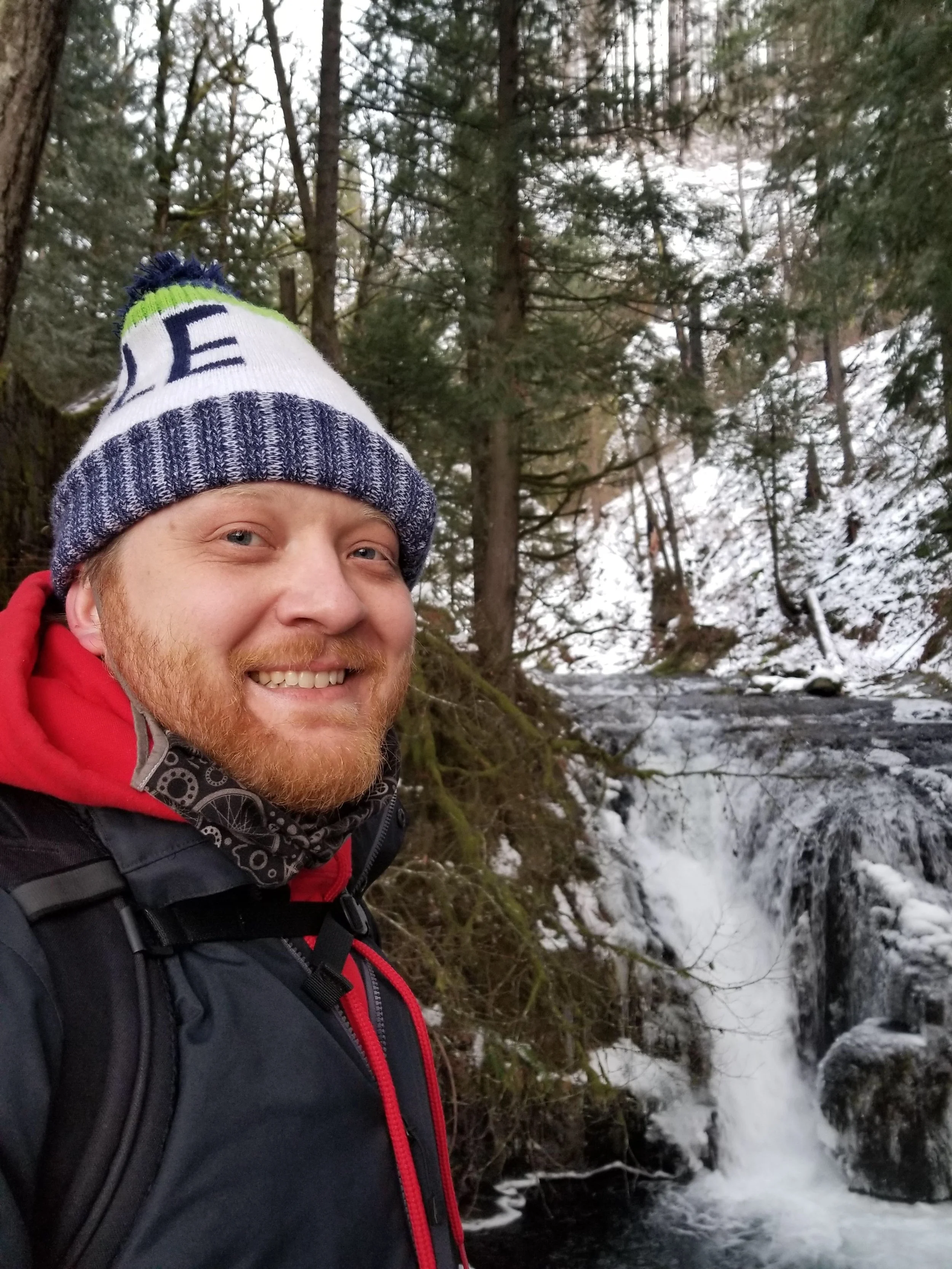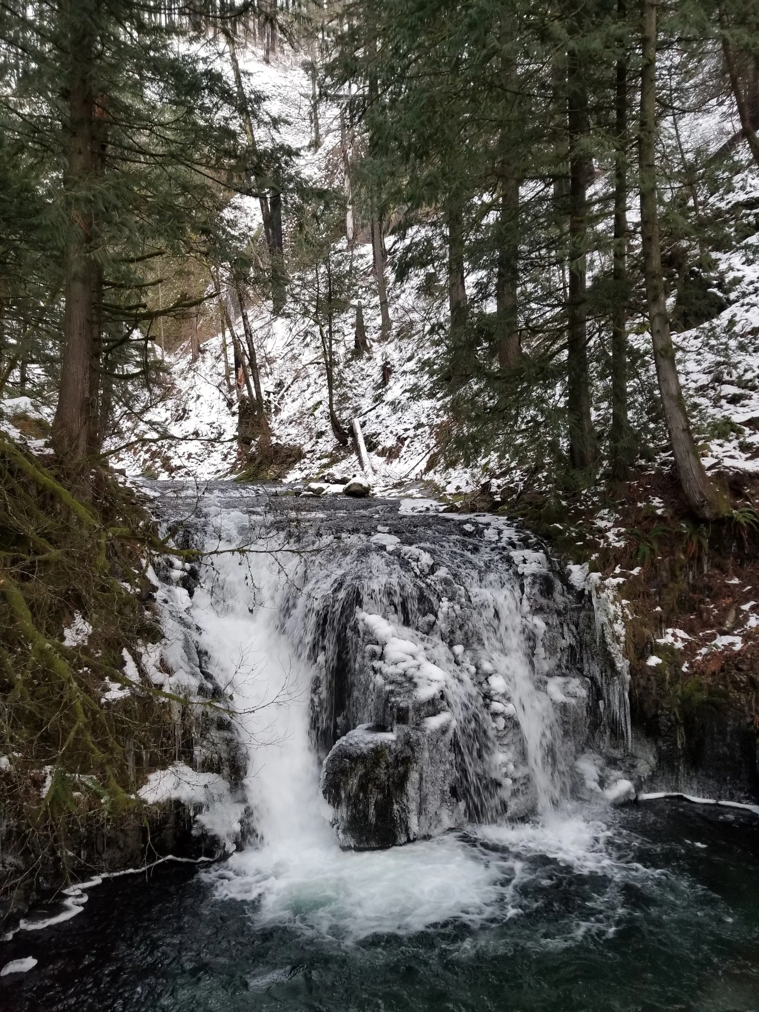 Back to the story. Saturday before we even made it out of the parking lot we saw a lady fall in her UGG boots- ice was visible as far as you could see and of course the nearer to the falls and the higher up you go the thicker the ice became. This lady was the first of many- meaning nearly everyone save just a couple we saw other than ourselves- who had no traction at all. We did see a handful of people with yaktraks but those seem worse than nothing as we saw many sliding in them but they had been given confidence by thinking these devices would help them. These really aren’t grippy enough with as hard as ice is. Instead I highly recommend spikes. Whenever we have worn them we have not slid at all-not an inch. The only thing I feared at Multnomah was a human domino situation where a bunch of people crashed into me as there were so many falling all over. Cory and I jogged through and past trying to keep clear of the crowd (we are pretty conscious of our fear of COVID and I am of someone falling on me as falls take me a while to recover) and it felt a bit like we had superpowers. A bit of added security was having our poles as they make you very stable. I only really felt like they were needed when people were around as if they did crash on me I would be less likely to fall.