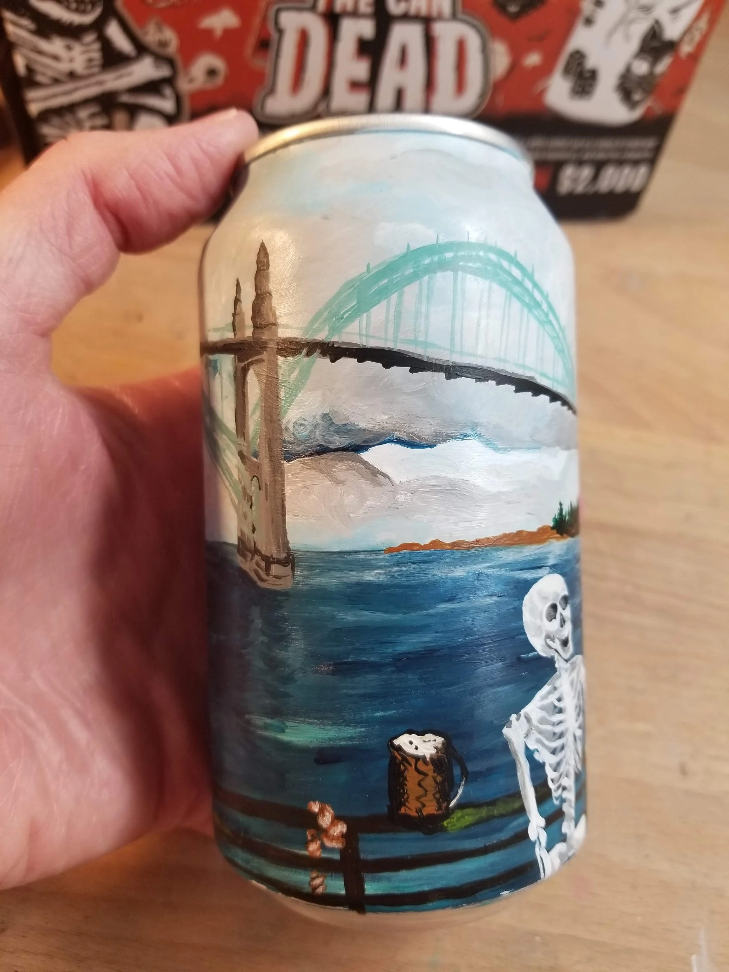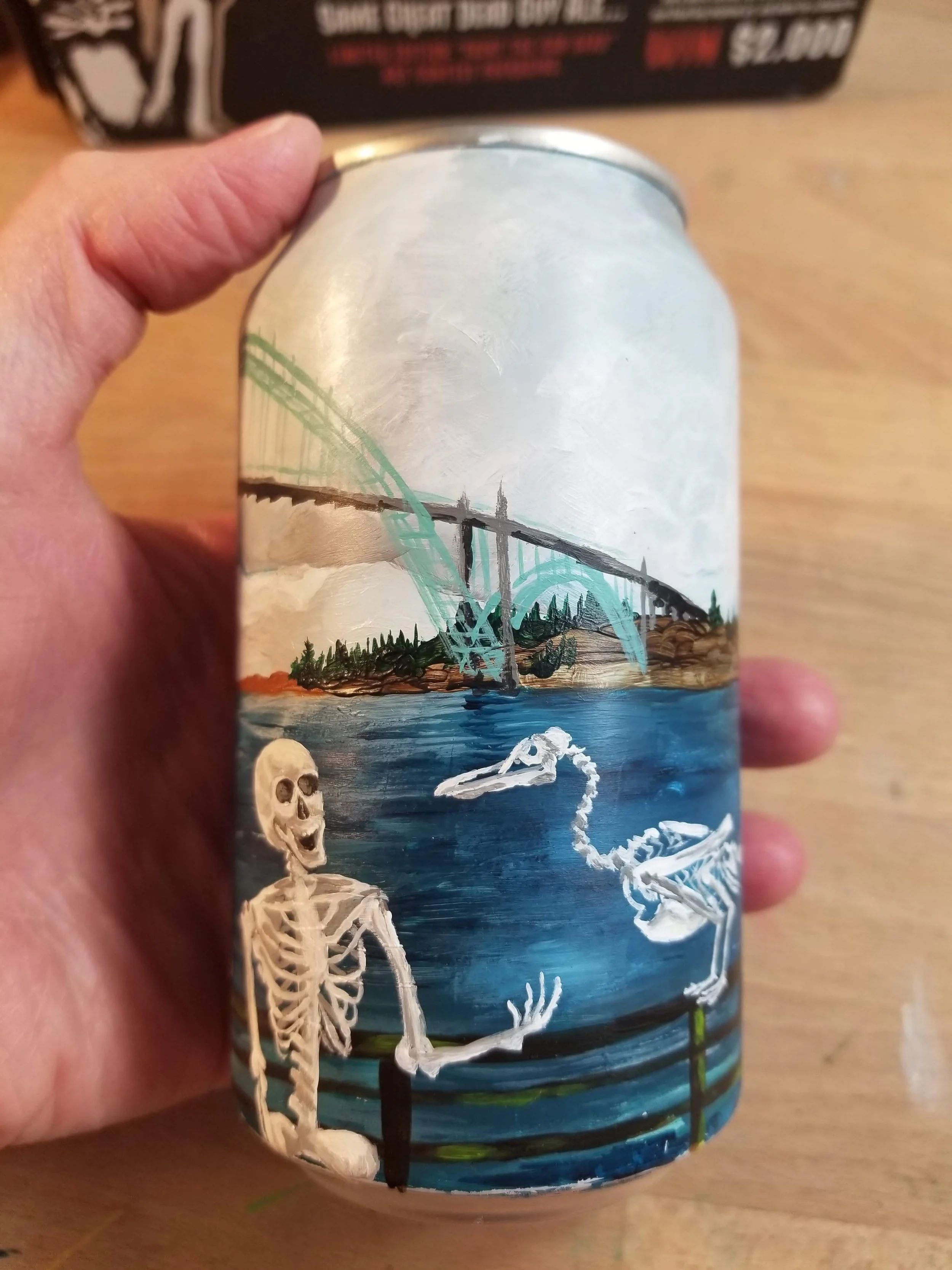 My can design is painted in acrylic directly on the can and features a skeleton chatting it up with the skeleton of a seagull. The gulls are ever-present at the coast so that was a must. I have them on the pier outside the brewery where lots of crabbing takes place (hence the rope knotted on the railing) and a stein of beer on the rail as a nod to the beer Dead Guy is holding in the original. The scene takes place under the Yaquina Bay Bridge as it is the one you drive over to get to the brewery and it features largely on the landscape in Newport.