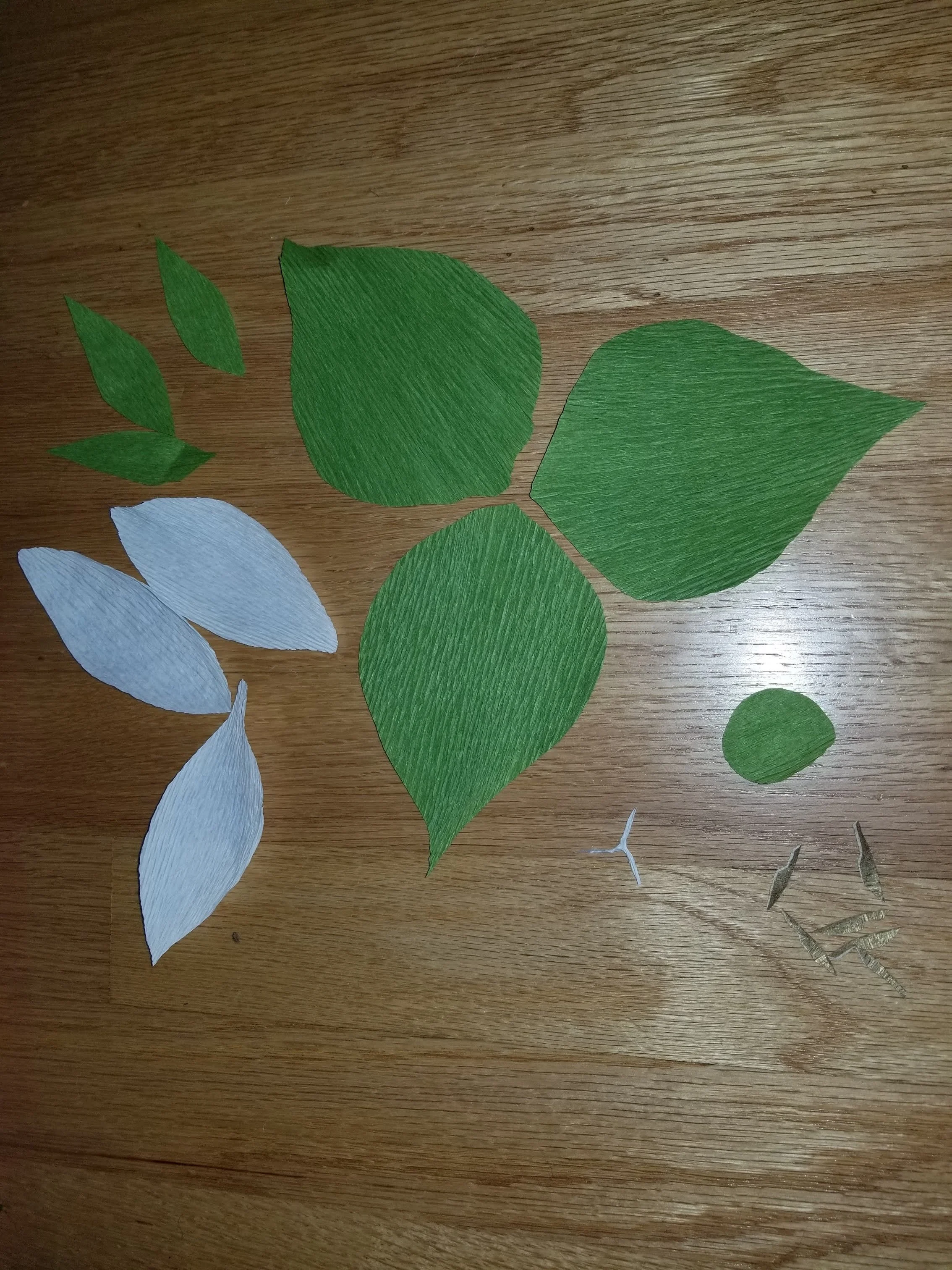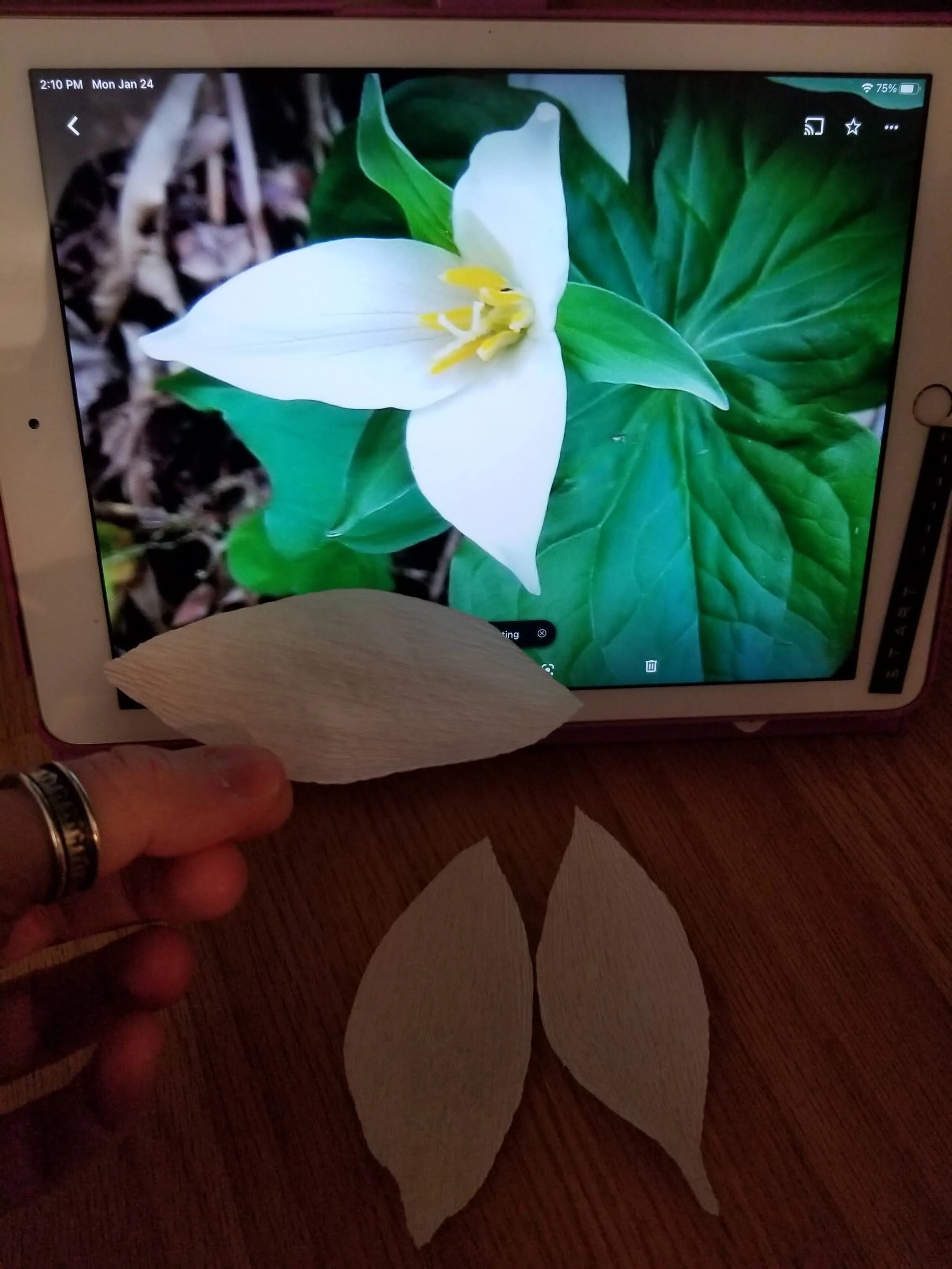 Looking at a photo of a Trillium I took on a hike one spring, I cut pieces to match what I saw. Crepe stretches, so some trimming up may need to happen when you stretch them to round them out and give them shape. I didn’t have yellow so used gold instead (hey, this is a craft, it doesn’t have to be exact! I could paint it yellow, but think the gold is fun.)