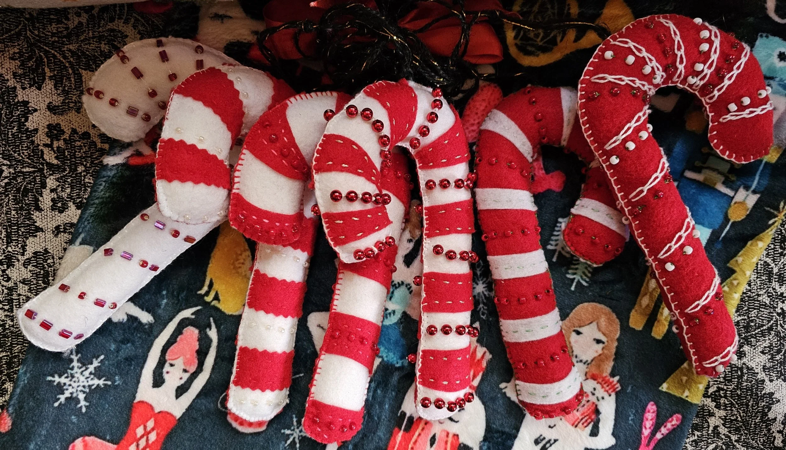 I used embroidery floss and cotton perle threads, jute rope for their loops, and did a blanket stitch on each to close them up. The stripes I varied and when making them with felt, I would cut out an extra cane to cut into the stripes using straight scissors or pinking shears.