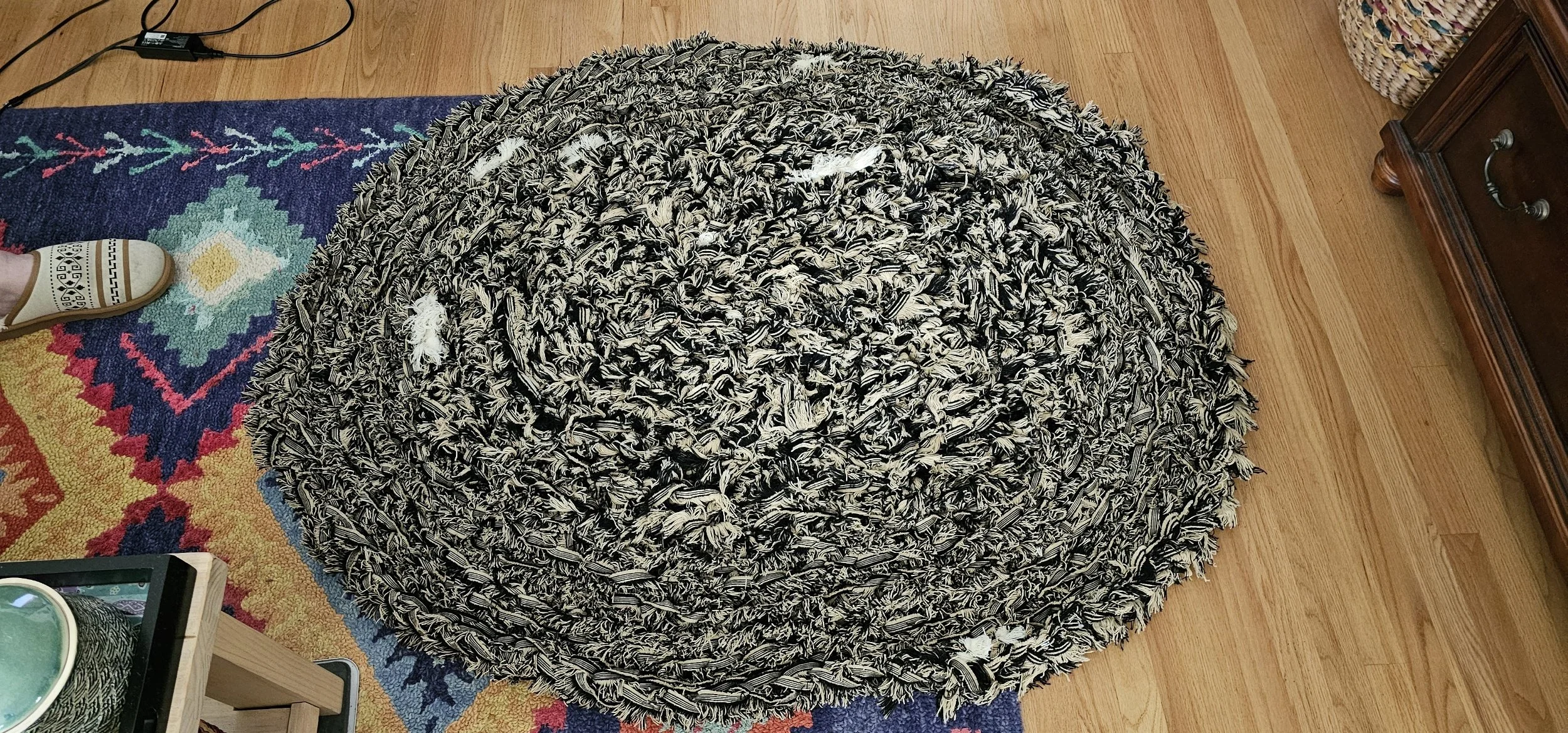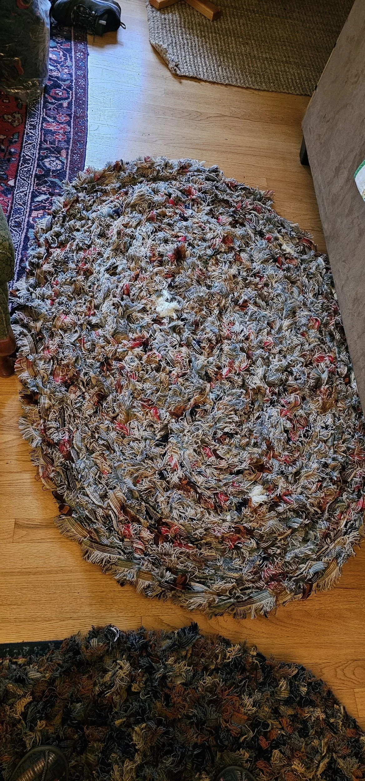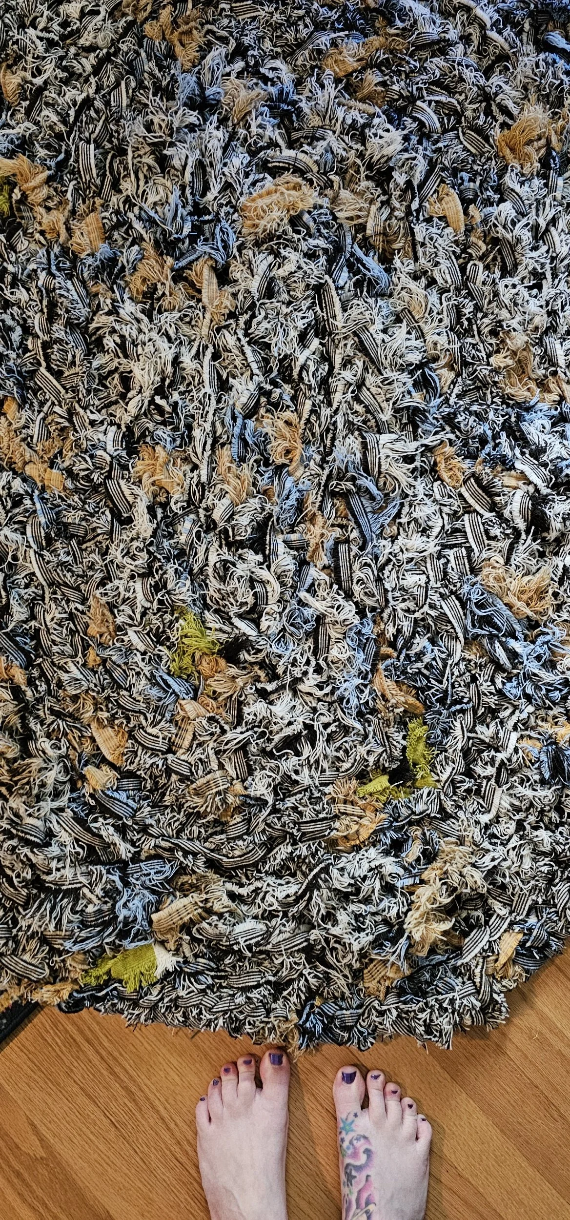 This is my experiment in washing and drying one of the rugs. I made this one and it was a rougher texture, so I felt a want to wash it and see what happened. It came out napped and fluffy, like a sherpa texture, and stretched a bit more evenly than I had managed pre-wash.