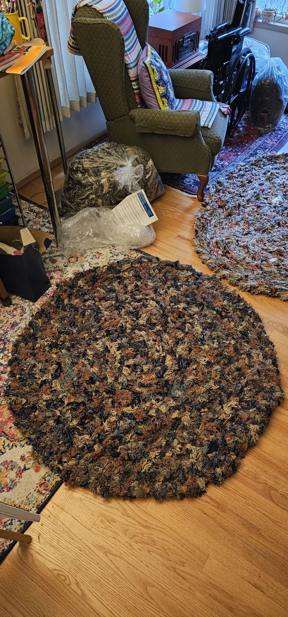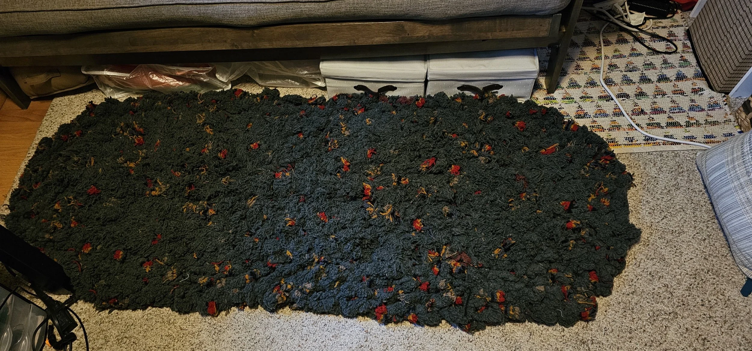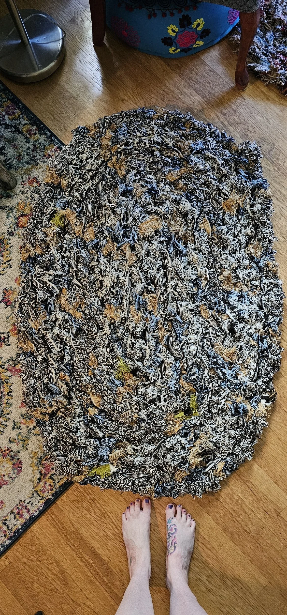 This is my experiment in washing and drying one of the rugs. I made this one and it was a rougher texture, so I felt a want to wash it and see what happened. It came out napped and fluffy, like a sherpa texture, and stretched a bit more evenly than I had managed pre-wash.