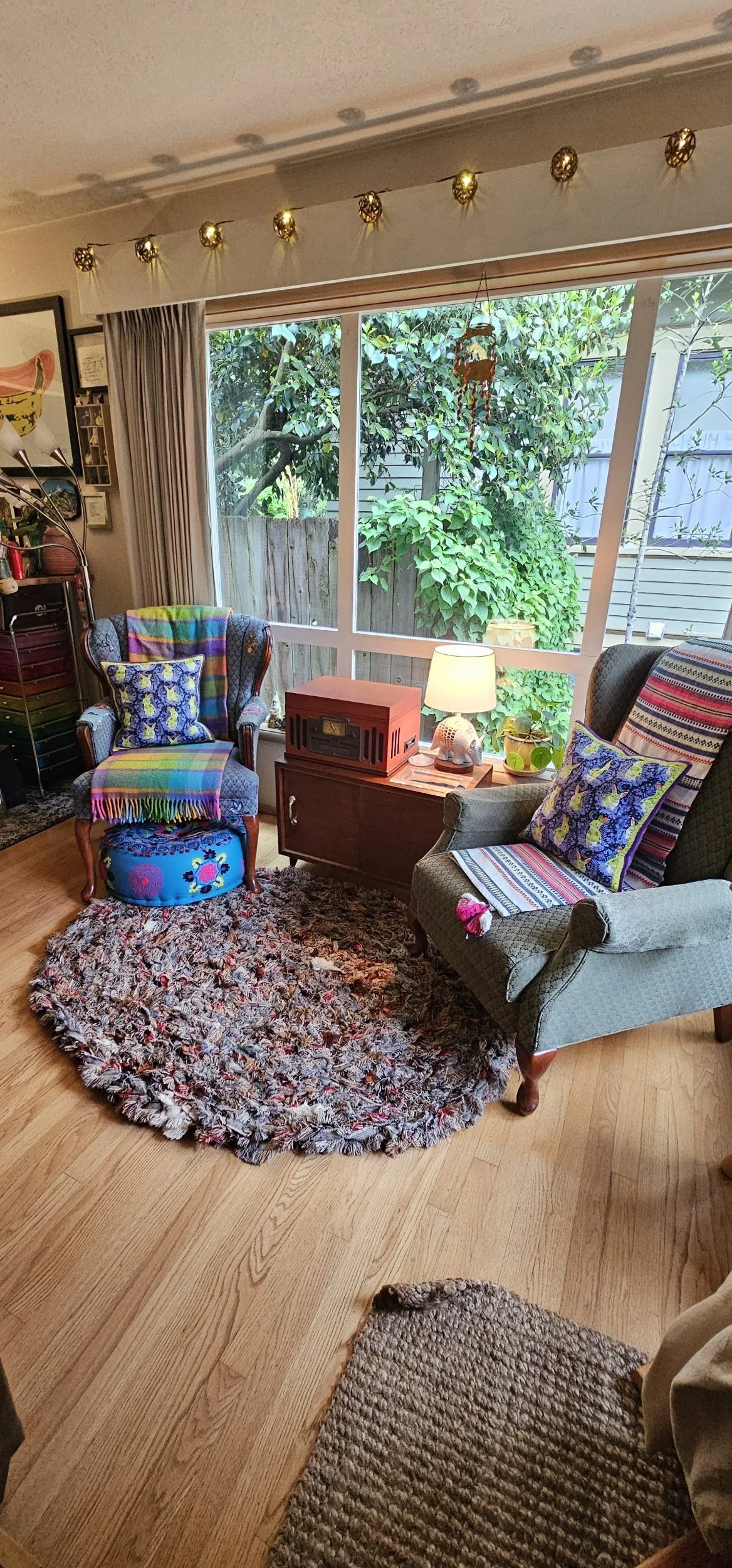 My dad picked out this wool, started a rug, and just didn’t quite get the hang of it. He said it was mine to finish, but instead I totally remade it after he went to bed so he had it to take home with them the next day. He was so happy with it!
